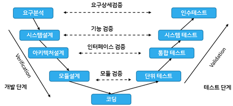 - 폭포수 모델에 시스템 검증과 테스트 작업을 강조한 모델이다.